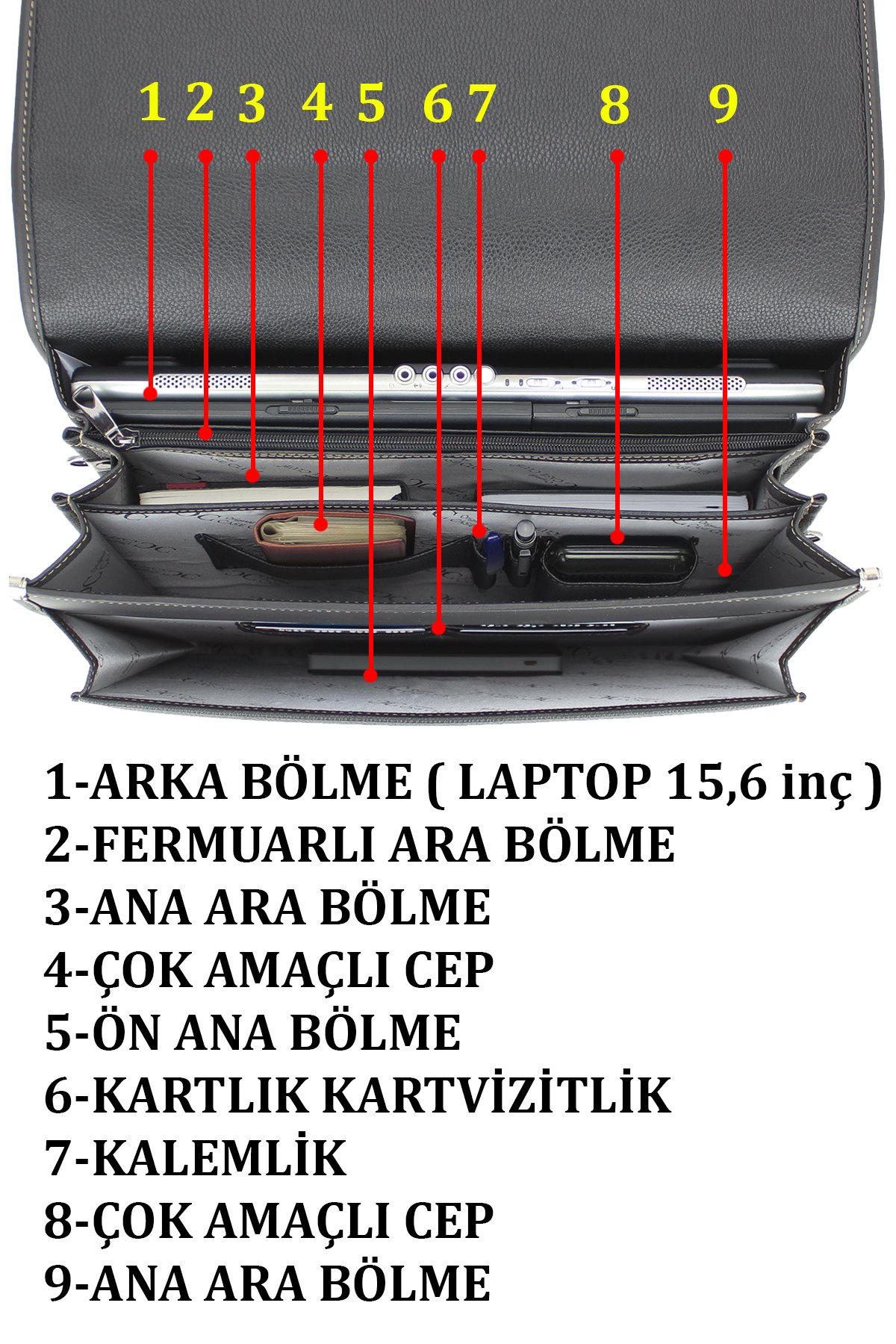 (-) Çanta içerisinde bir adet ana arka bölme ( laptop 15,6 inç ) iki adet ana ara bölme , bir adet fermuarlı ana ara bölme , bir adet